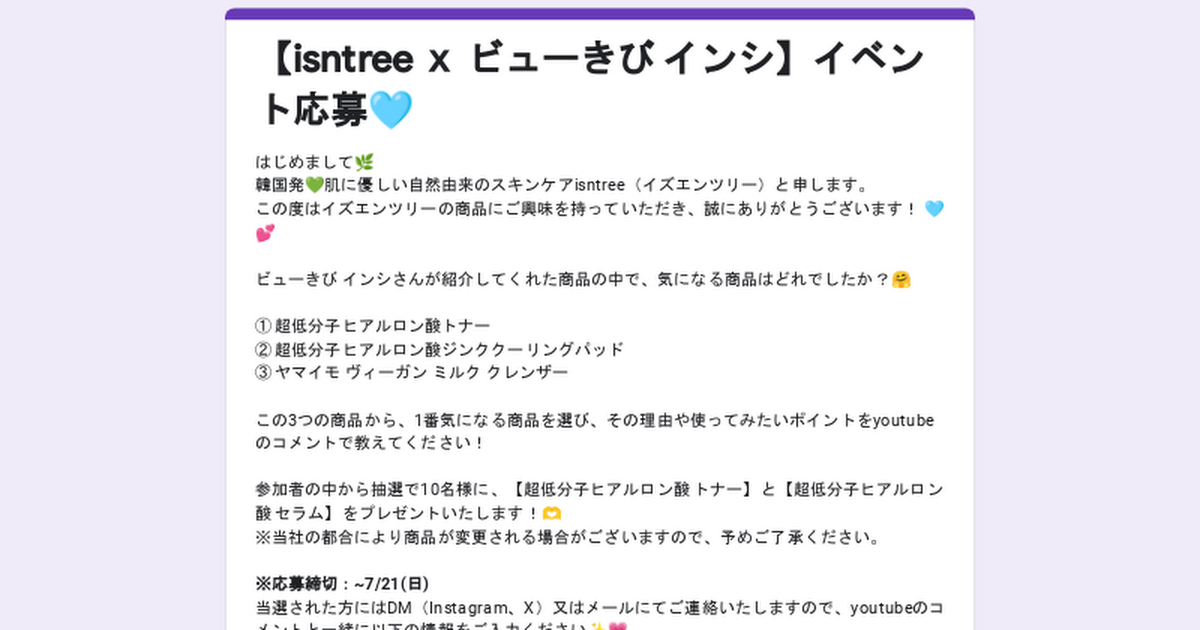 【isntree ⅹ ビューきび インシ】イベント応募🩵