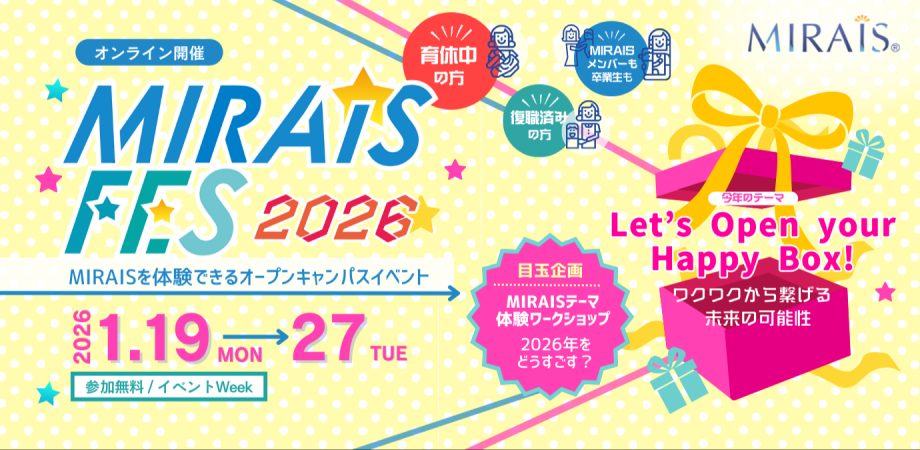 MIRAISフェス2026 開催!🎁Let’s Open your Happy Box! 〜ワクワクから繋げる未来の可能性〜産・育休からはじまり、復職期... powered by Peatix : More than a ticket.